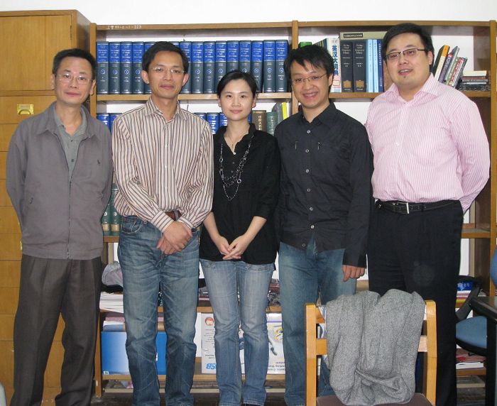 图书馆馆长钱仁平教授(左二)、馆长助理韩斌老师(右一)与中央音乐学院图书馆乐谱部主任黄安乐老师(左一)一行合影
