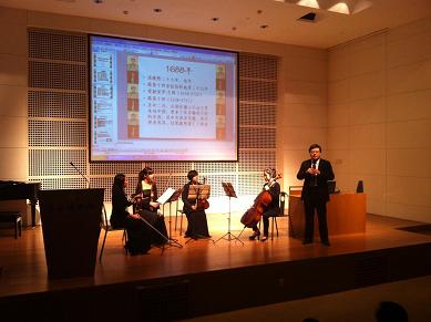 为配合主题,留学生女子四重奏组演奏了亚美尼亚民歌主题四重奏《Theme of Armenian Folk songs》、弦乐四重奏《阔步向前》(Stalk along)及海顿《C大调弦乐四重奏》“皇帝”之第三乐章;留学生民乐三重奏组则为大家演奏了江苏民歌《茉莉花》、《小河淌水》及二胡独奏《二泉映月》等曲目。