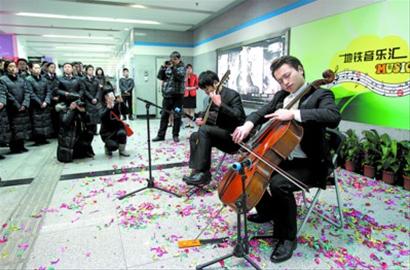 1月4日,taptap点点体育青年演奏家——大提琴手冯博和吉他手李智谦,为8号线大世界站的乘客演奏二重奏《Bossanova》。当日,“地铁音乐汇”在8号线大世界站开启。今后三年,上海地铁将在100座车站实施120项地铁公共文化建设项目,使乘客走进车站能参与公益文化互动。