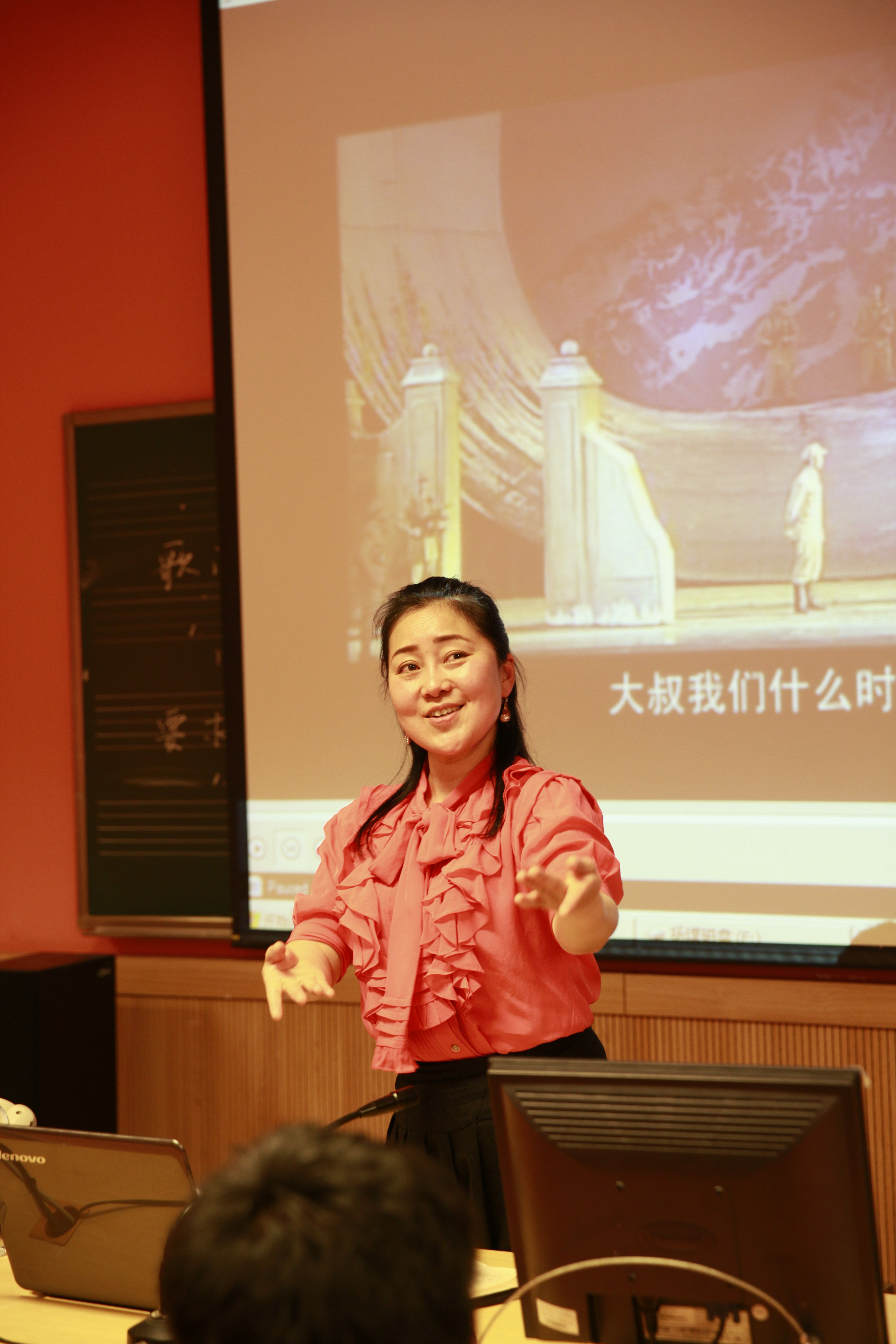 孟锦慧老师播放了多个版本的《江姐》和《冰山上的来客》选段,并做了一一讲解和分析,从舞台形体、身段走位、服饰文化、声音唱腔等多视角向同学们展示了中国歌剧的魅力。