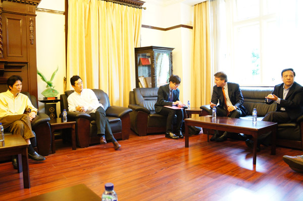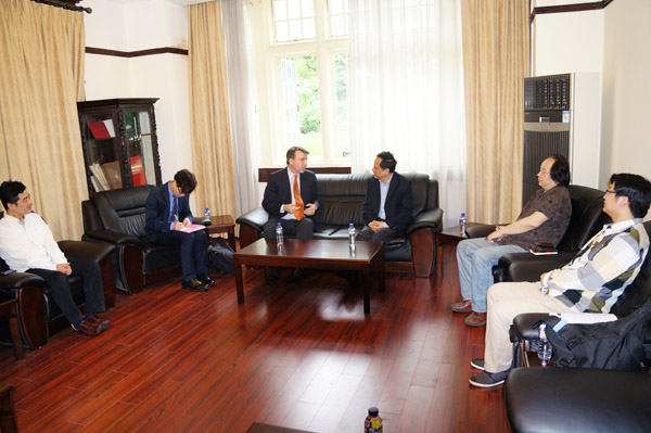 坎贝尔先生等一行来访,与副院长张显平教授、作曲系主任叶国辉教授、音乐工程系主任陈强斌教授、现打系副系主任杨茹文教授进行了会谈。会上,双方就计划签订的两校校际交流框架协议中的部分与爵士乐理论与演奏、音乐制作、录音、电子音乐等专业师生交换项目相关的条款交换了意见并希望以此协议为指导开展两校间的师生交换、互访项目以及两校合作办学等不同层次的合作。