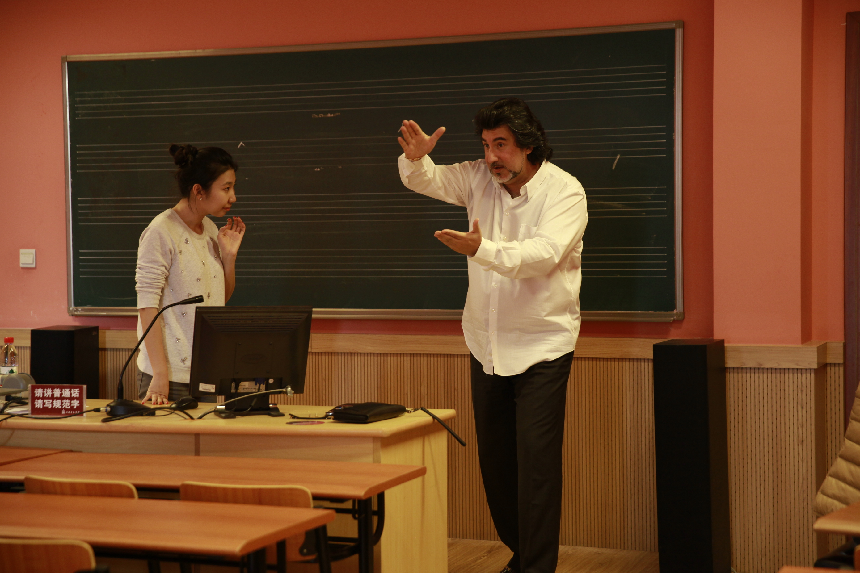 11月3日-21日,Thomas教授每天下午为4名同学进行声乐训练和示范教学,共计60人次的授课受到师生们的广泛好评,其声情并茂的讲学,大家普遍感到收获很大。有几天,在结束公开示范教学后,Thomas教授还为一些同学进行一对一的专业小课教学,这种敬业精神受到师生们的广泛赞誉。此次教学活动,由我系邱曙苇副教授担任翻译。