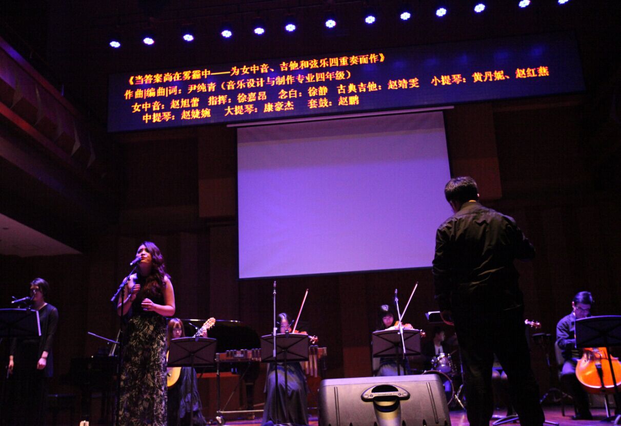 在陈强斌教授的简短发言之后,真正的乐手上场了。9人的乐队奏响的是尹纯情的《当答案尚在雾霾中》。这首讲述历史的歌曲在听觉上也有一种历史的厚重感,虽然是一个不到7分钟的独立作品,却让人感到像是一出宏大音乐剧的片段。
