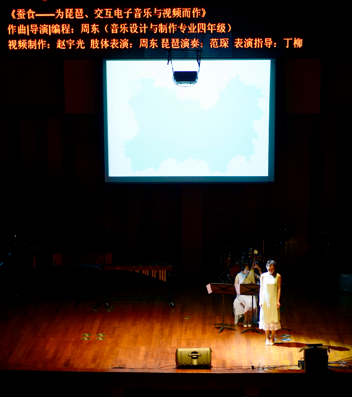 周东《蚕食》是一首为琵琶、交互电子音乐与视频而作的新媒体作品,肢体表演者的动作影响着电子声部的进行,而台下操作计算机、效果器的“演奏者”也使琵琶、电子、视频融为一体。然而这一切并不只有技术上的意义,它们也共同体现了因果循环的禅意和一种试图打破循环的强烈情绪。