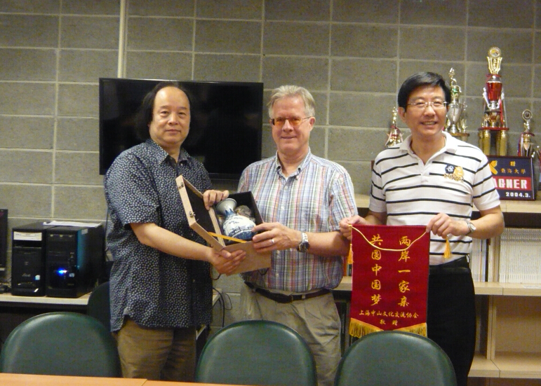 (民革taptap点点支部主委叶国辉教授代表参访团向台湾东海大学互赠礼品)