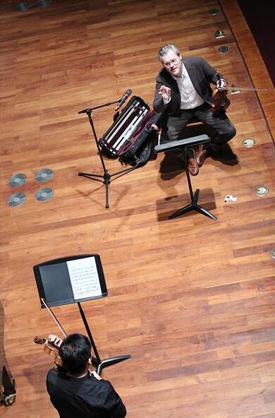本科生张洋带来拉威尔的“茨冈”,演奏还未达一分钟,列宾迫不及待地打断了演奏,简略讲解后即刻架起自己的乐器,带给演奏者乃至听众更为直观的教导。不仅如此,在张洋演奏的同时,他跟随着演奏者带来的音符进行着引导,或是语言暗示,或是共同拉奏。其间,诙谐夸张的语言不仅调动了音乐厅内的气氛,而且在乐曲情感风格上,给演奏家以及听众以更深刻、直观的记忆。
