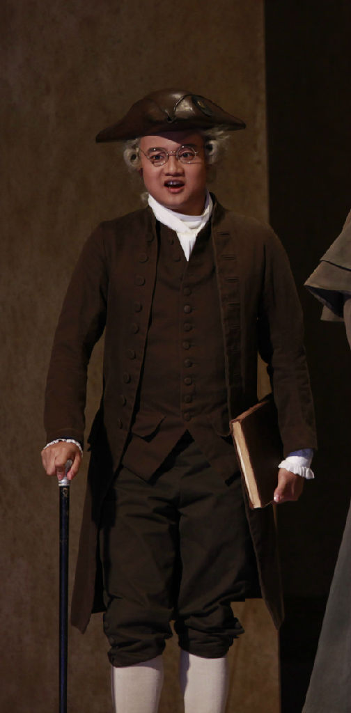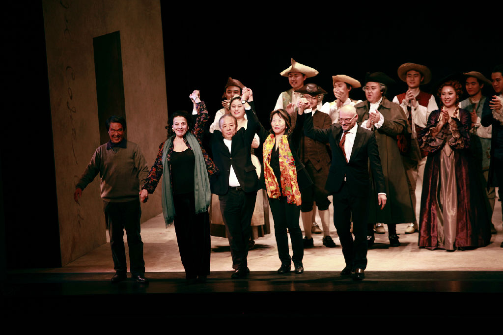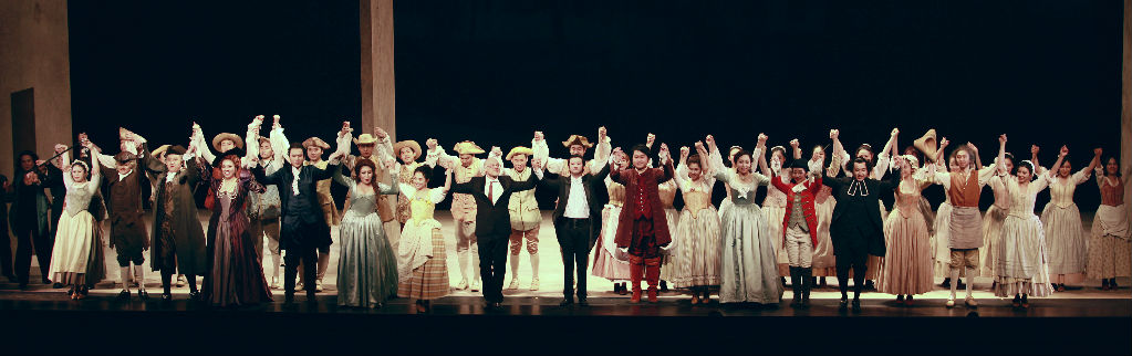 当指挥在挥完最后一个音后,这出历时长达三个半小时的皆大欢喜的歌剧终于落下了帷幕。红色的幕布再次拉起,全体演员与导演组登台向观众致意,观众则报以一阵又一阵雷鸣般的掌声。