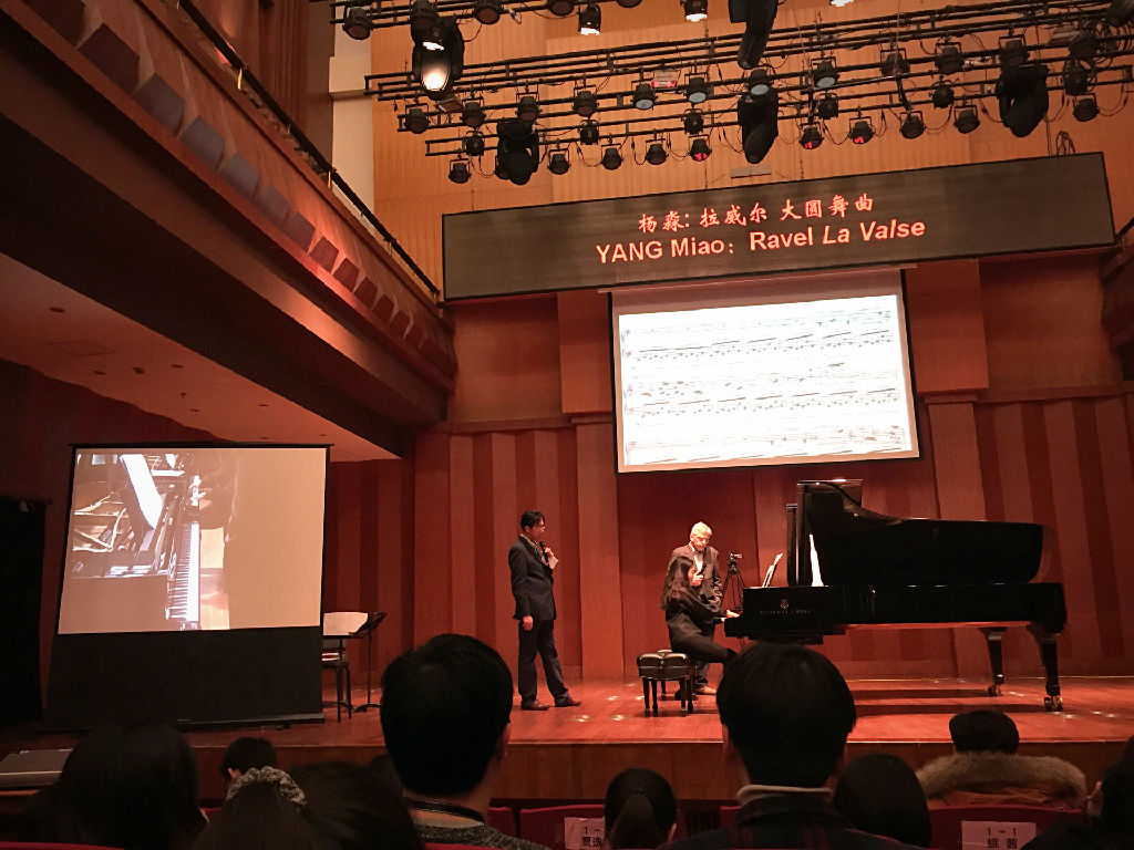 大三的杨淼学姐演奏了拉威尔的大圆舞曲。大师对段落间的联系和整体的节奏进行了透彻的讲解,并在个别音上反复进行了推敲。之后,大师对音乐色彩的变化和句子里的呼吸、连线的处理,讲了一些自己的想法。