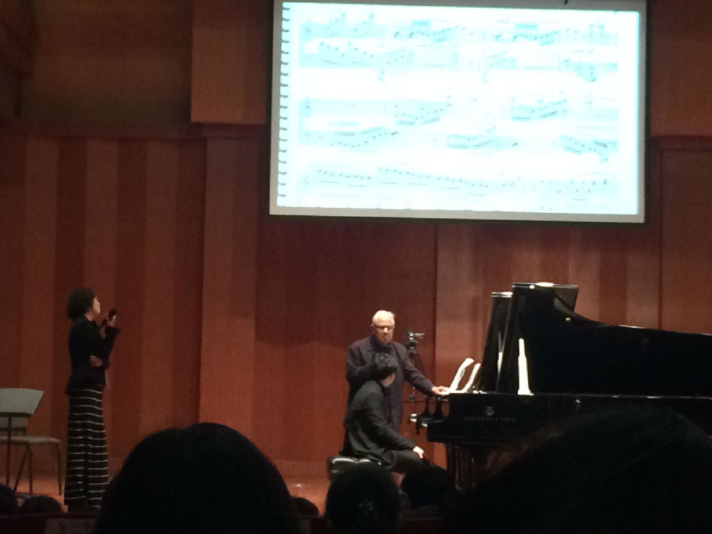 大师非常亲和、认真。在听第一位毛已豪同学演奏李斯特匈牙利狂想曲No.12的时候,为了寻找更好的声音以便更好的讲解,走下台坐在观众席中,认真的欣赏,并时不时的用笔做标记。演奏后,大师先位同学非常详细滴介绍作曲家及乐曲发展的趣事。接着就左手八度一只手还是两只手演奏进行了讲解。大师对谱子中的表情记号要求也是非常严格。在上课中,大师表示我们平时不应该忽视,应该重视踏板的练习。大师也不停地为同学做示范,通过两个投影大屏幕让大家都可以看的更加清晰。
