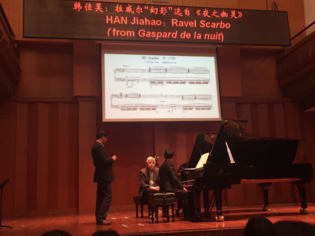 接下来是韩佳昊同学演奏的拉威尔的“幻影”。听完后,大师表示“Perfect”,并对两次音乐中的高潮部分表示赞赏。大师在相同句第一次、第二次出现处理中,应该出现不同的音乐轻响、色彩、对比方面进行了分析。