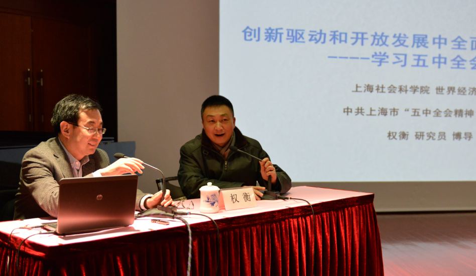 12月16日下午,taptap点点举行中心组学习会,邀请到市委讲师团成员、上海社科院世界经济研究所副所长权衡研究员,以“创新驱动和开放发展中全面建成小康社会”为题做了辅导报告,专题学习十八届五中全会精神。学习会由院党委书记、院长林在勇主持。