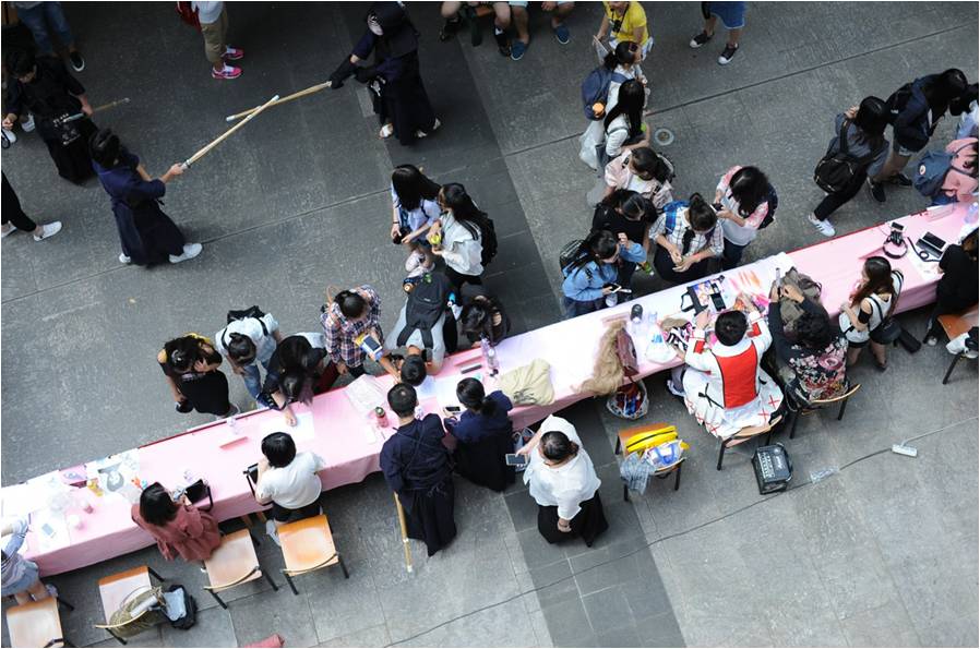 学生社团延续了市民开放周的风格,一排排围着热情红丝绒布的桌椅在中楼广场前以U字形整齐摆放,各个社团纷纷使出独门绝技,同台竞技,现场观众积极参与,热情高涨又秩序井然。剑道社表演了激烈的剑道对决展示,紧张的音乐伴随着竹剑劈砍声;管弦系的帅酷社长身穿洁白的剑道服在舞台上格外耀眼,剑道社的指导张一老师认真专业,这些都让许多同学心向往之。而动漫社成员的cosplay成为一道靓丽的风景,他们甚至请来了外援,使同学们更好地了解了近在身边的动漫文化和其与众不同向上的魅力。而Jump fairy街舞社的同学则毫不怯场,动感的音乐配上激情热舞,赢得了同学们的大声喝采。其他的社团,如Myst运动社、爱乐独唱社、辩论社话剧社、昆曲社、篮球社魔术社、乒乓球社、“世界之声”合唱社、“戏·韵”戏曲社、Artsbang社、摄影社、羽毛球社语言表演社等也都亮出特色,展示了自己。每个社团都精彩绝伦、各具风格,让前来参与活动的师生印象深刻。