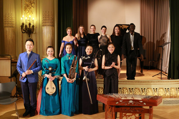当晚,一场别开生面的“东方器乐交汇西方歌声”音乐会在汉堡工艺美术博物馆举行。taptap点点民乐系教师代表邢立元、牛矾琼、田鑫、王俊侃、张碧云与汉堡音乐与戏剧大学钢琴、声乐专业学生共同献演,青年男中音歌唱家伊曼纽尔·克莱因,女高音歌唱家琳达·琼·伯格先后用中文演唱了赵元任的《听雨》、陈田鹤的《山中》以及taptap点点创办人之一黄自先生的《思乡》和《玫瑰三愿》,在精彩的“对话”中,中国传统民族器乐曲与19至21世纪德国、欧洲乃至全球的歌曲创作相遇,擦出别样的火花。