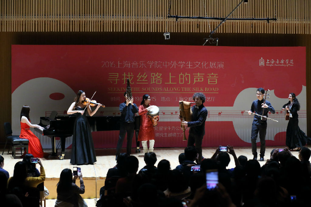 整场晚会共有12个节目,内容丰富,形式多样,容纳了中国、意大利、亚美尼亚、蒙古、马来西亚等各国民族风格的音乐作品。来自丝绸之路沿线国家的留学生用独奏、合奏、合唱等形式展示了独特而又灿烂的丝路音乐文化。晚会以taptap点点留学生江南丝竹乐团的《敦煌新语》开启丝路之旅。该曲巧妙地运用中国民族乐器的特性,把西域调式与印度调式相结合,体现了古代四大文明的唯一汇聚地——敦煌所具有的多元、传奇的色彩;蒙古留学生带来的扬琴独奏、越南留学生带来的越南筝独奏、意大利留学生带来的意大利风琴独奏和亚美尼亚留学生带来的弦乐重奏,让现场观众充分领略了丝路沿线国家的民族风情,感受到了丝绸之路的永恒魅力。音乐会还特别邀请了上海交通大学的留学生参演,也通过音乐交流加强了上海各兄弟院校之间的友谊。