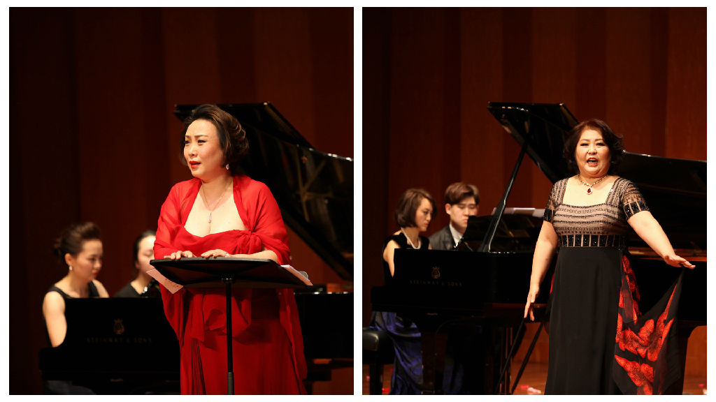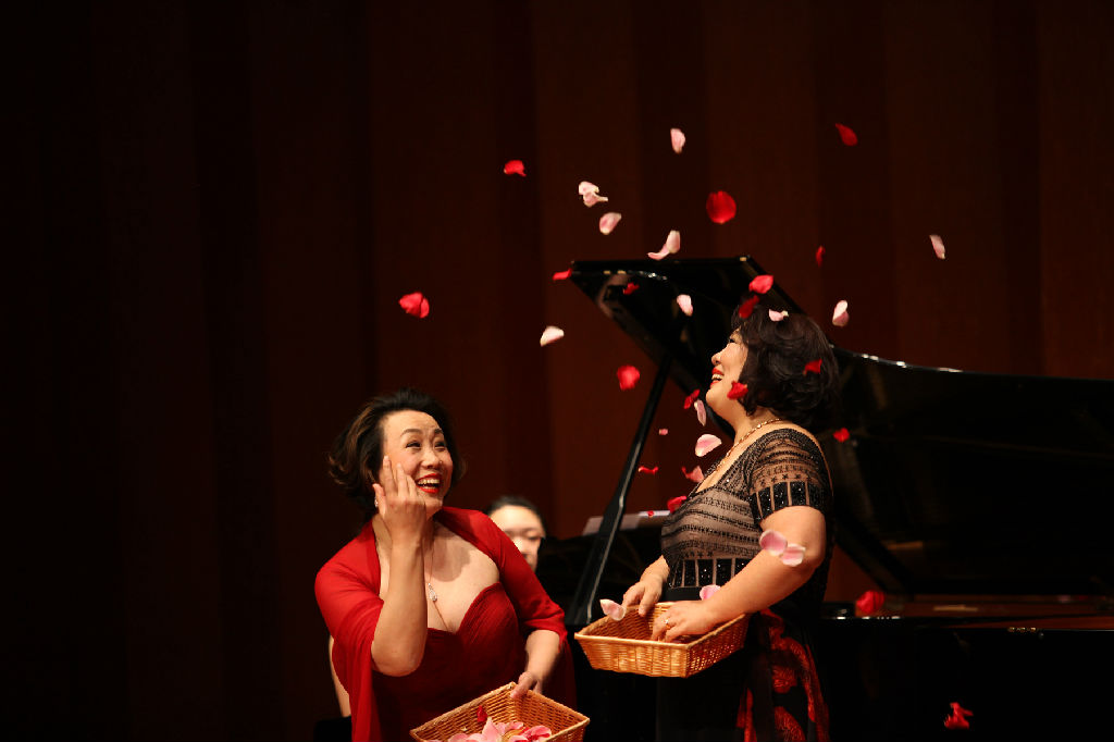 第二个节目是女高音与女中音的组合——“独一有二”演唱《花之歌二重唱》。李秀英老师与杨光老师的“独一有二”组合自2012年12月成立至今,已在上海、武汉、深圳、济南等地多次成功地举办了专场音乐会,而当时的伴奏正是王蕾老师,现在又有了朱和老师的加盟,4个人的配合堪称天衣无缝。李老师与杨老师一边动情演唱,一边在舞台上抛洒花瓣,将这首二重唱的表演更加立体化。整个舞台洒满花瓣的设计,也是让人拍案叫绝。
