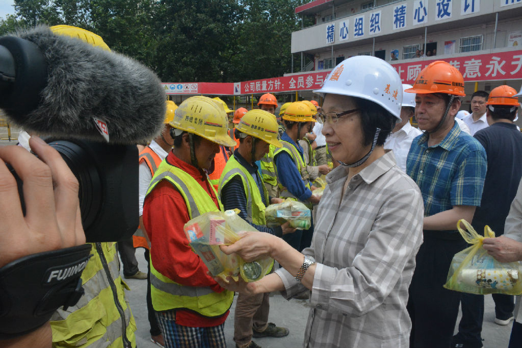 殷一璀与工人们一一握手,送上防暑降温用品,询问交谈,叮嘱施工单位重视安全生产,提醒大家一定要做好高温期间的防暑降温工作,对坚持工作在一线的建设者们表示感谢和慰问。