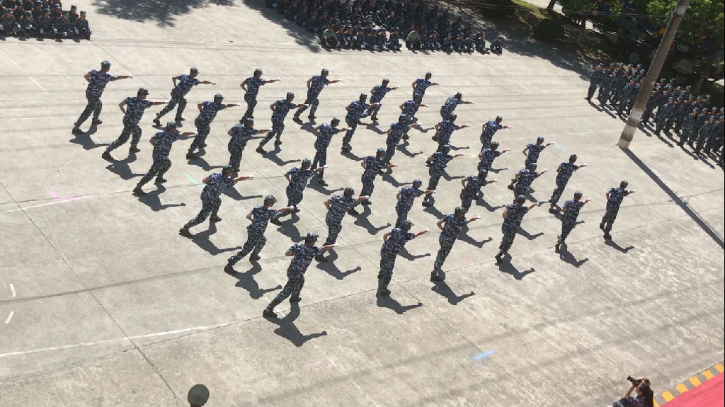 汇报表演中,首先由八排女生展示了队列动作,立正、稍息、敬礼、三大步伐的转换以及行进与立定等训练成果,动作整齐划一;由一、二、三排男生带来的强军拳表演,勇猛刚强;值得一提的是,军训基地倪总教官在taptap点点90周年之际为军训连精心编排了具有校庆倒计时寓意以及象征音乐图形的队列操展示,表达了同学们对母校90周岁生日的美好祝愿。