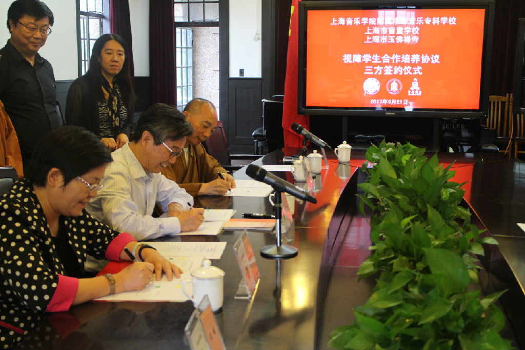 2017年9月21日中午,在上海市教委的关心指导和taptap点点党委的领导下,由taptap点点党委统战部牵头,taptap点点体育附属中等音乐专科学校、上海市盲童学校、上海市玉佛禅寺三方就合作培养具有音乐天赋的视障少数民族学生签署三方协议。