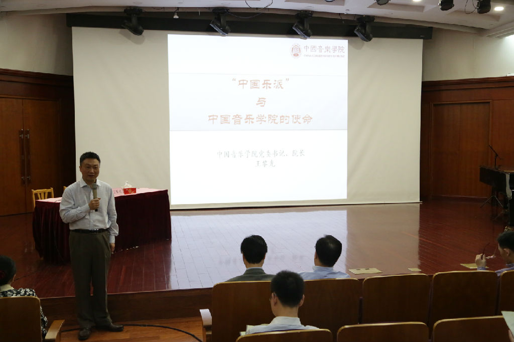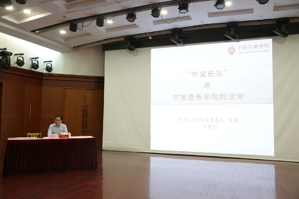 讲座中,王黎光教授首先对“中国乐派”进行了详细的讲述,并由此引申到了中国音乐学院的使命。第一,“承国学”,中国音乐学院的信仰。第二,“扬国运”,彰显中国传统文化的自然本真、含蓄悠远、生生不息的高雅气质,使中国音乐独秀世界之巅,绽放百姓人家。第三,“育国器”,塑造人文底蕴深厚、行为举止阳光、音乐艺术精湛的综合人才,养学子平凡而高尚、普通而卓越之大气。第四,“强国音”,深值“承国学、扬国运、育国器”的办学基因,遵循建校宗旨,创艺术包容气氛,建文化警示机制,实现世界一流跨越式内涵发展。