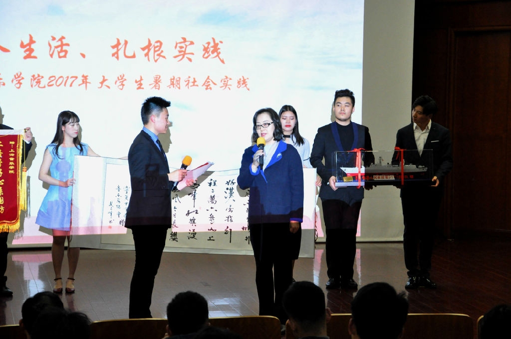 此次活动的亮点是院领导也加入到活动中,和同学们一起宣讲。院党委副书记、纪委书记刘艳在第三部分“深入生活、扎根实践”环节中,向在座师生介绍今年暑期taptap点点社会实践活动背景、十支队伍概况、后续实践计划等,同学们现场暑期实践各支队伍收到的锦旗、海军模型、笔墨等,体现实践队伍所到之处军民对taptap点点的认可与肯定。