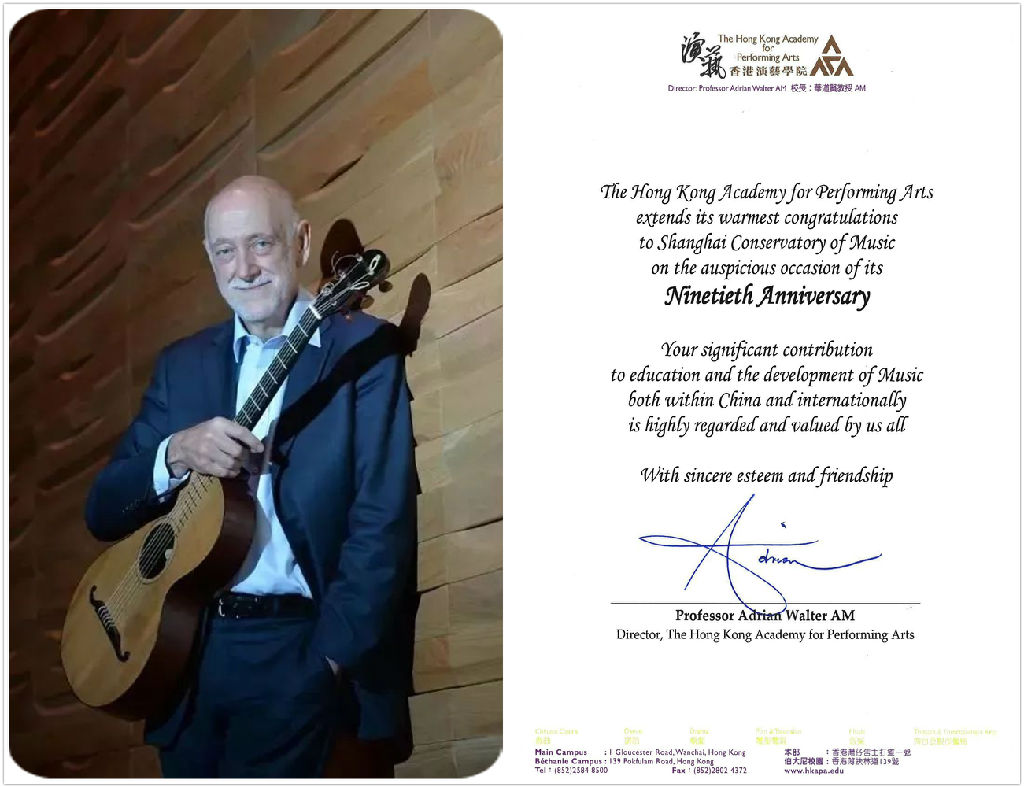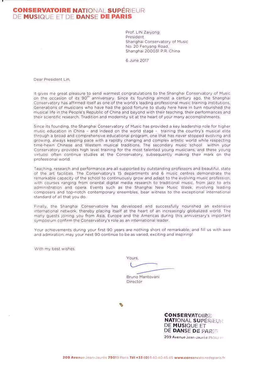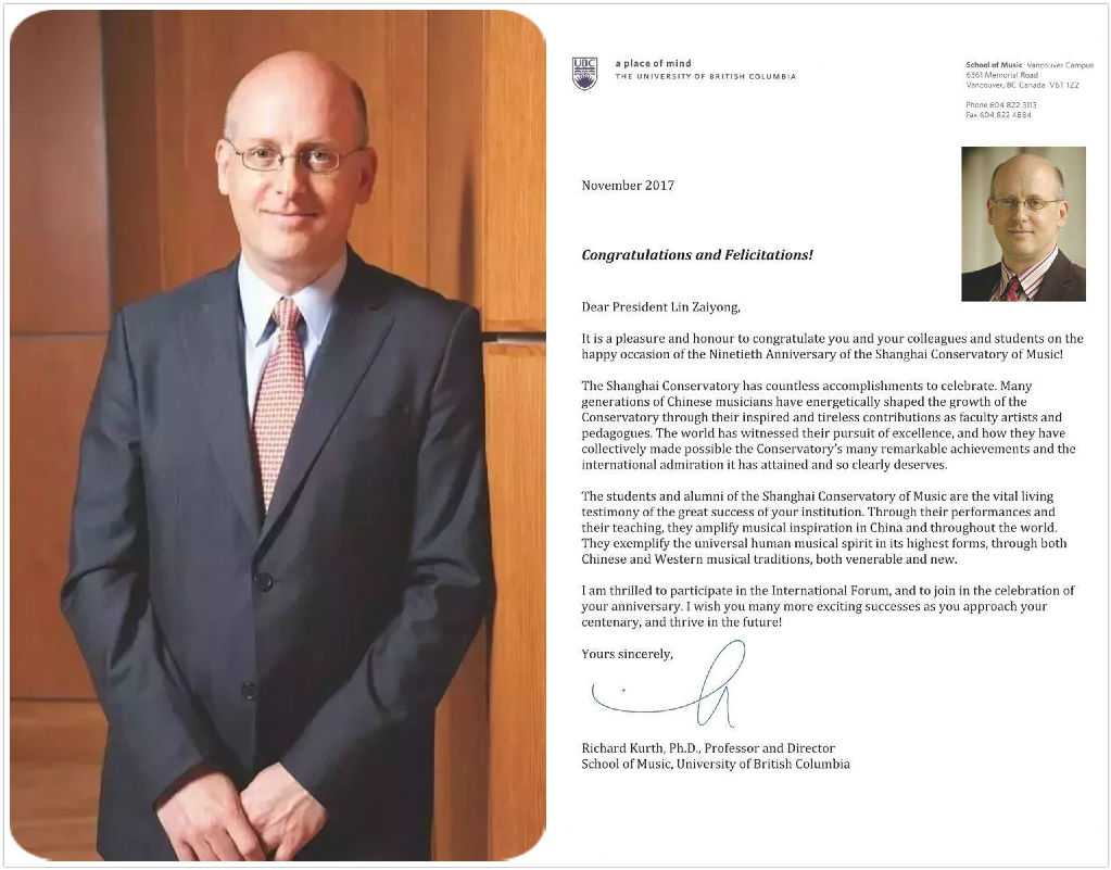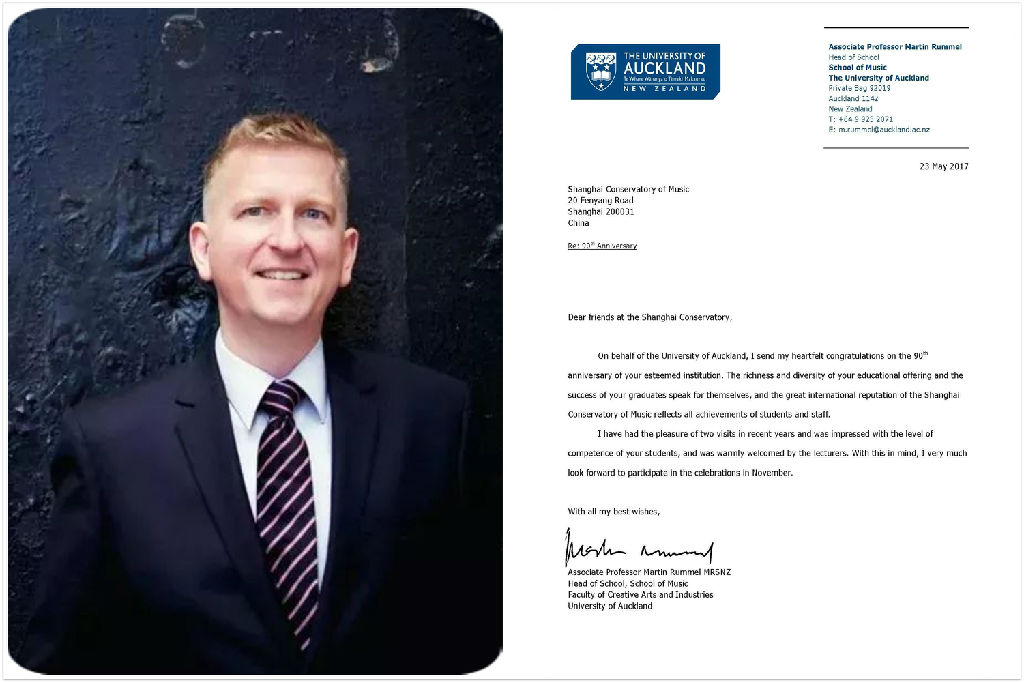 我们同为太平洋音乐院校联盟成员,作为姐妹学校,我们向贵校在过去90年中为培养音乐专业人才所作的杰出贡献致敬,也祝贵校今后发展顺利,取得更大的成就!