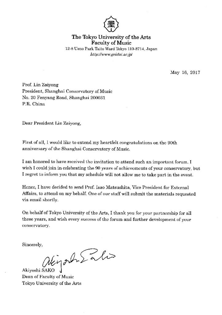 我代表东京艺术大学感谢贵校多年来的支持与合作,在此预祝论坛圆满成功,祝贵校的事业蒸蒸日上,稳步发展!