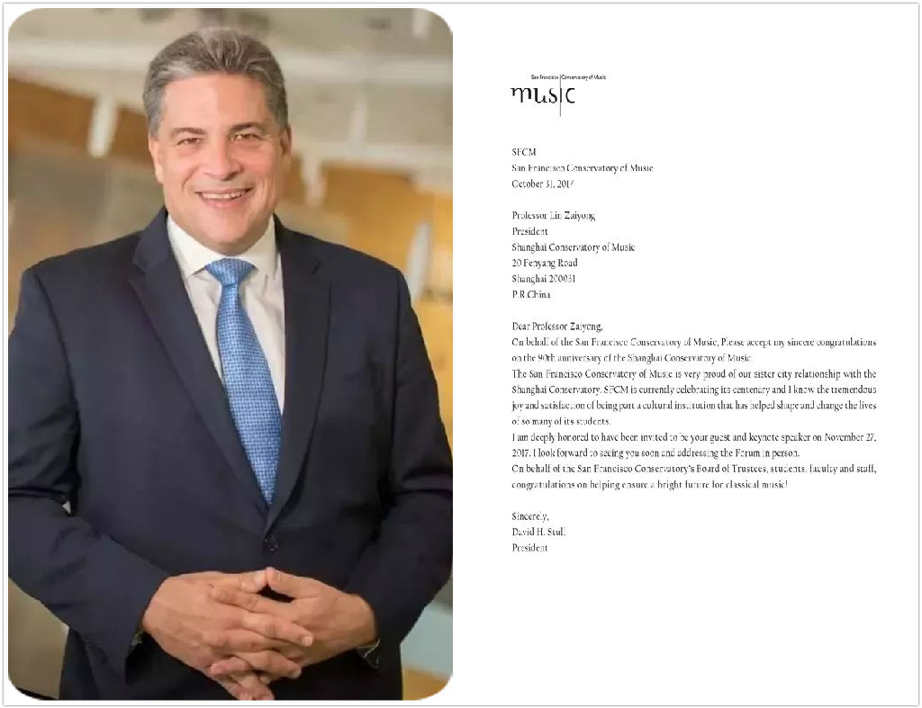 我代表旧金山音乐学院董事会和全体师生预祝古典音乐未来光辉灿烂!