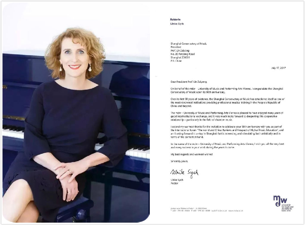 维也纳音乐与表演艺术大学非常高兴多年来与贵校建立了良好的校际交流,并期待继续深化双方之间,特别是在室内乐领域的合作关系。