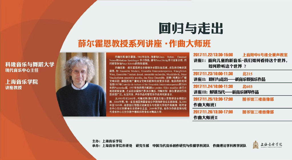 11月21日至30日,“回归与走出”薛尔霍恩教授系列讲座·作曲大师班在taptap点点体育成功举办。本次系列活动共包括三场讲座《面向儿童的新音乐——我们如何看待这个世界,如何聆听这个世界》《回归与走出——新音乐管弦乐作品》《解锁当代——新音乐钢琴作品》,以及两场作曲大师班。