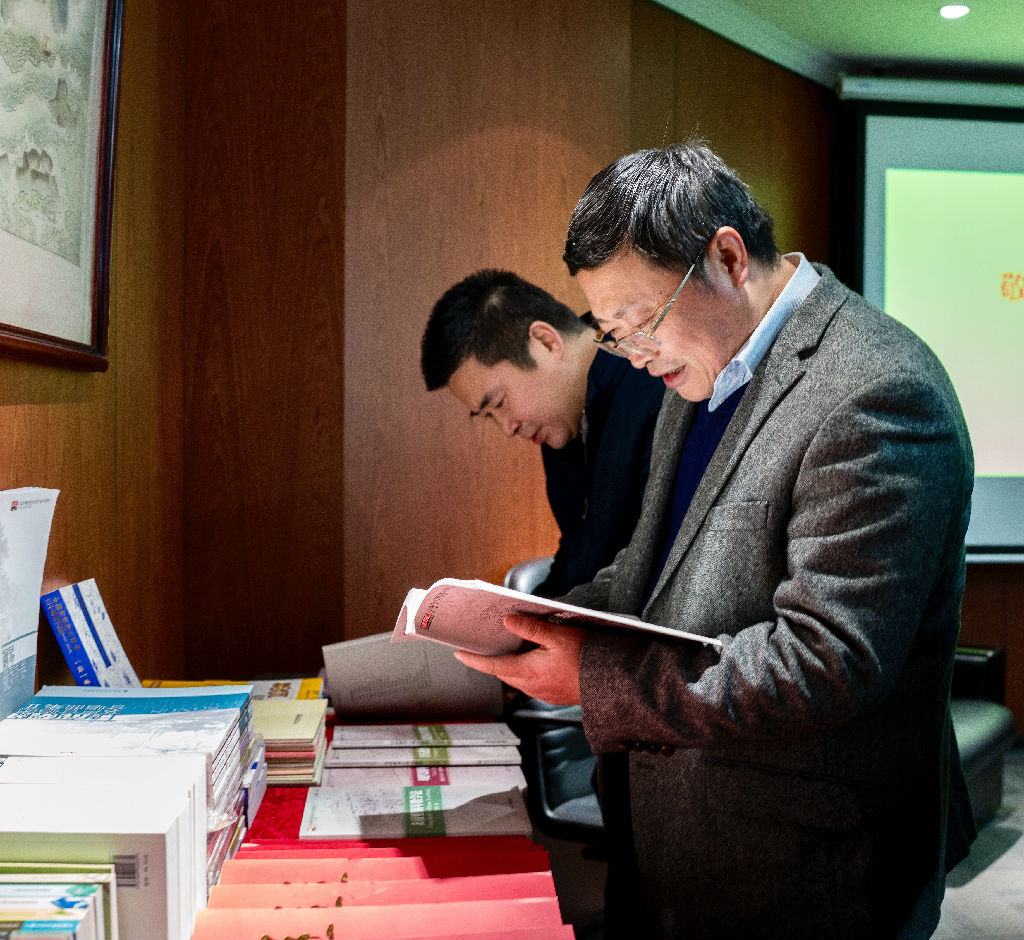 徐炯局长和彭卫国副局长翻阅出版社精品图书