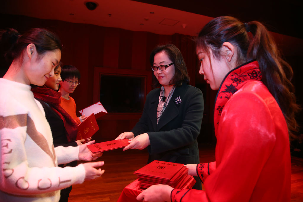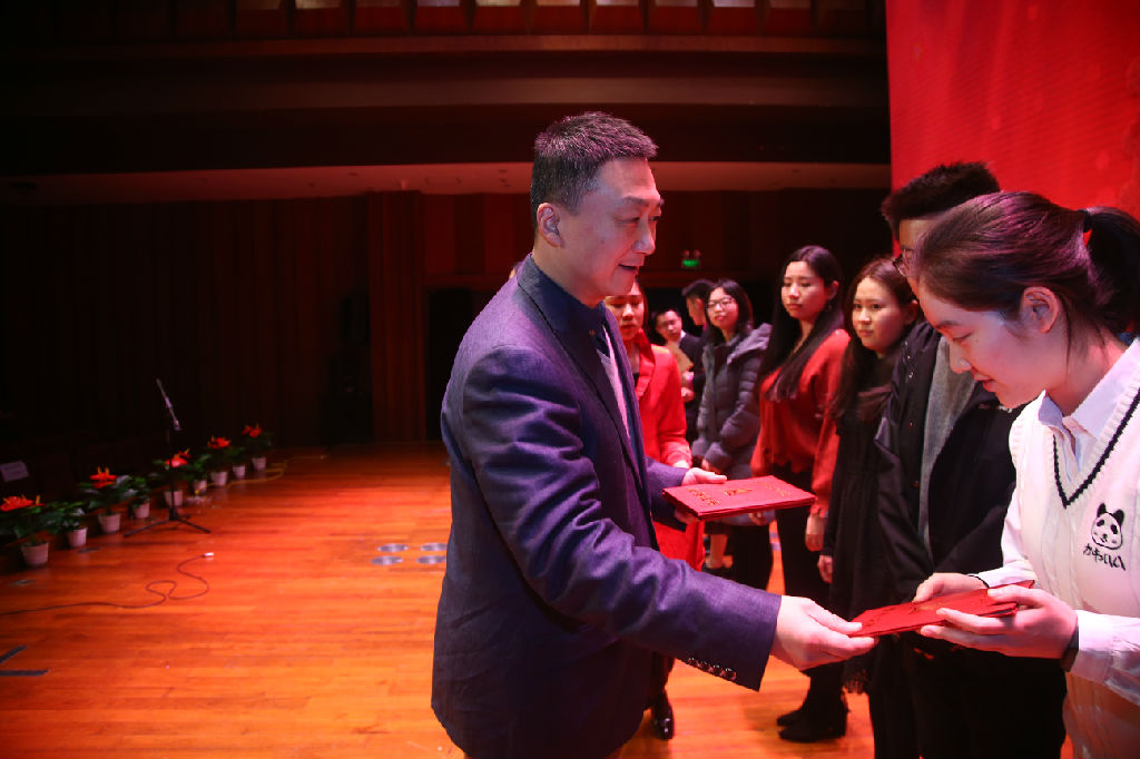 第三部分是社会实践板块,颁发了taptap点点2017年暑期实践荣获国家、市级及院级的各类优秀集体、个人及指导教师奖项。钢琴系王羽飞同学用她真诚的话语为我们再现了暑期社会实践活动中的精彩感人瞬间:我们在祖国各地通过志愿演出、学术交流等形式,使当地人民能够欣赏到专业音乐,我们也能够从民间采集原始素材。这样的体验和经历让音乐对我们有了全新的意义,我们从中感受到服务他人的快乐。
