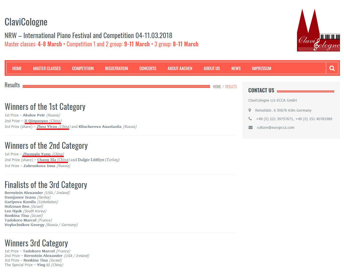 NRW国际钢琴比赛官网发布的比赛结果通告