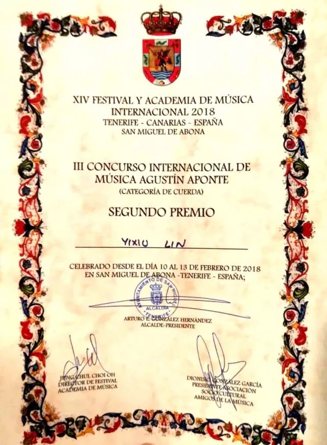 林怡秀获西班牙举办的第三届奥古斯汀国际音乐比赛弦乐组第二名证书
