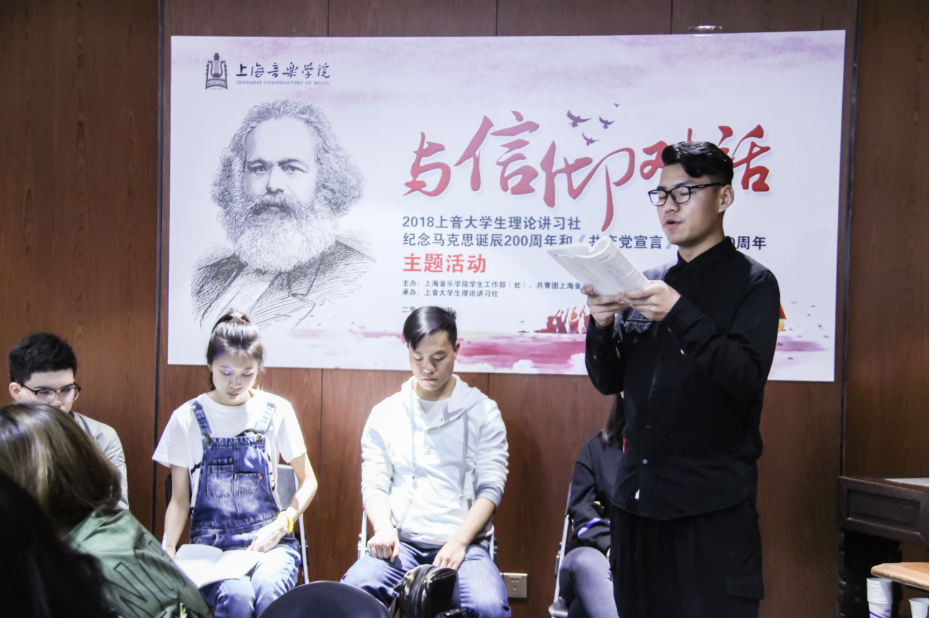 之后,研究生部的韩析宸、李帅强,数媒学院本科一年级的陈伊雯以及研究生部的张莹四位同学分别为大家朗诵《共产党宣言》引言等经典文献中的精彩段落。在座的师生们手捧《共产党宣言》,当读到动情之处如“一个幽灵,共产主义的幽灵,在欧洲大陆徘徊。”“资产阶级抹去了一切向来受人尊崇和令人敬畏的职业的神圣光环。它把医生、律师、教士、诗人和学者变成了它出钱招雇的雇佣劳动者。资产阶级撕下了罩在家庭关系上的温情脉脉的面纱,把这种关系变成了纯粹的金钱关系。”“全世界无产者,联合起来!”这些振奋人心的语句时,领读的同学们不由自主地绕场、同学们一起反复诵读了几遍,眼前仿佛再现出170年前的激动人心的一幕幕,并深深感受到伟大真理的永恒光芒。