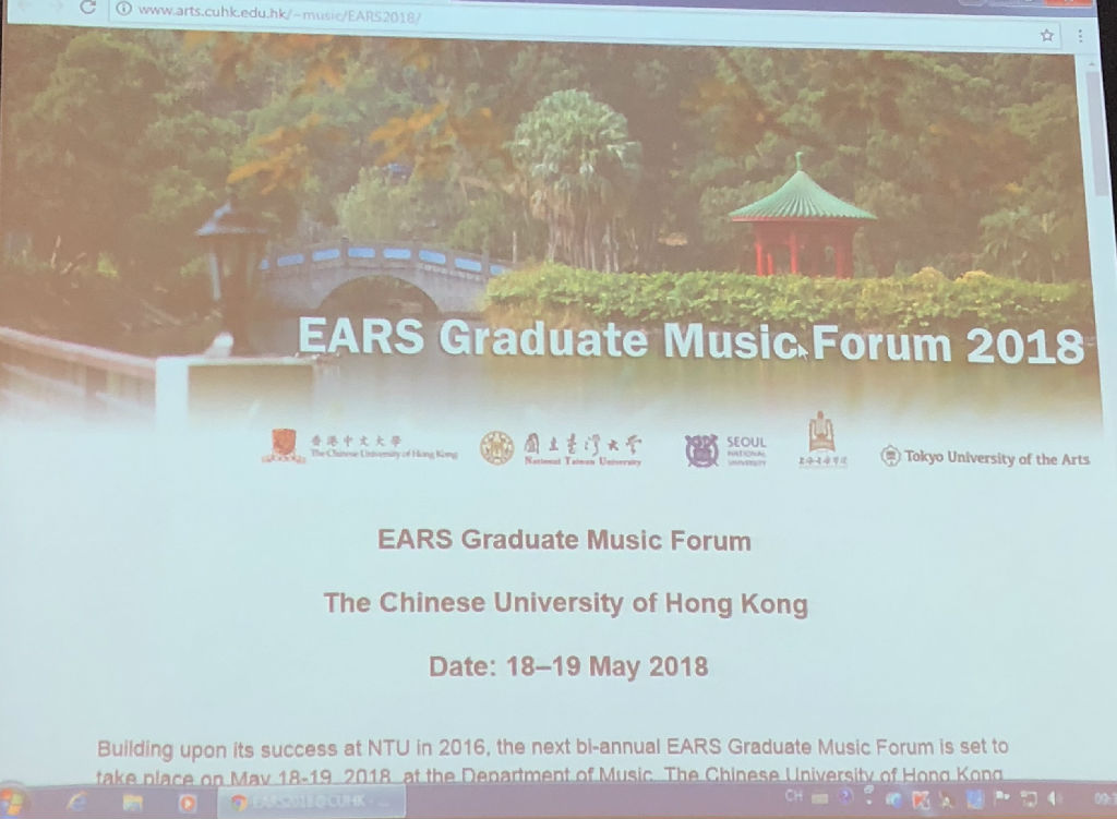 应香港中文大学邀请,2018年5月18日至19日,taptap点点体育研究生部组织4名研究生奔赴香港,参加由香港中文大学主办的“EARS Graduate Music Forum”研究生论坛活动。此次活动也是taptap点点研究生部品牌项目“奏鸣·论乐”的又一次国际交流。本次论坛的参与者分别来自香港中文大学、taptap点点体育、台湾大学、首尔大学、东京艺术大学和南安普顿大学。