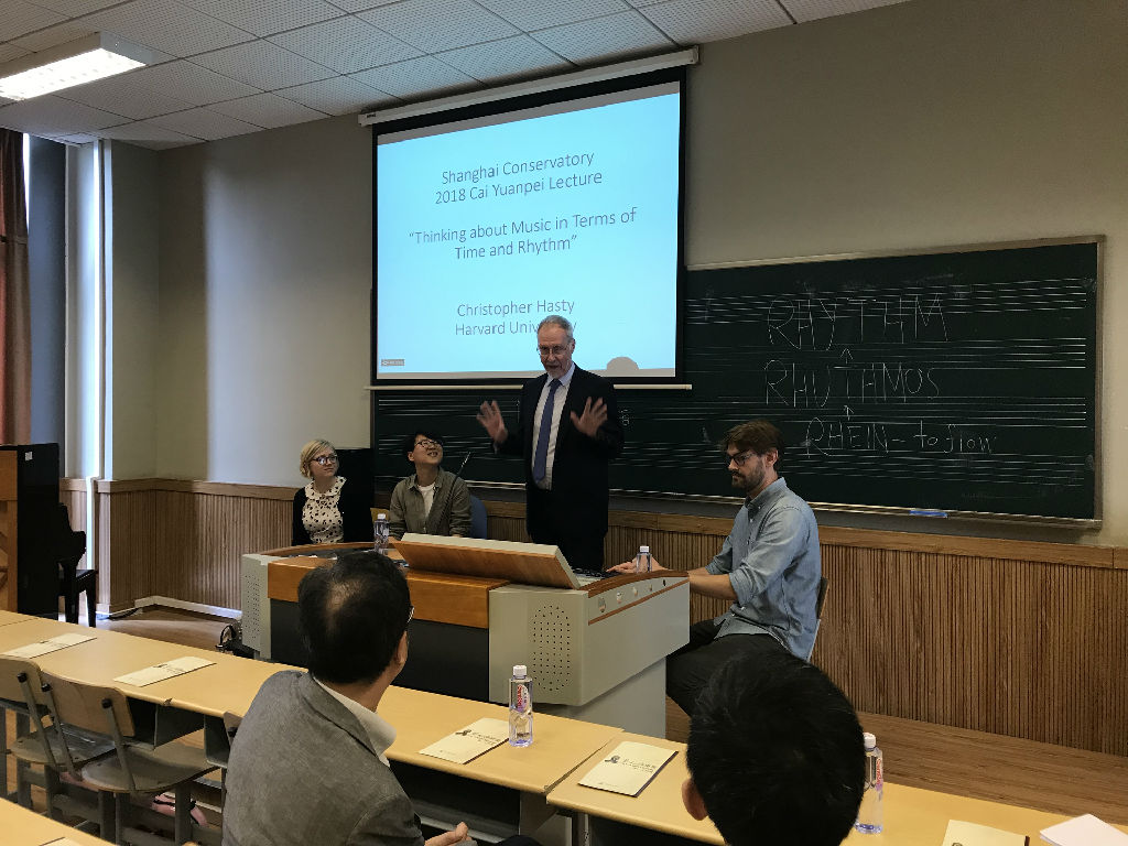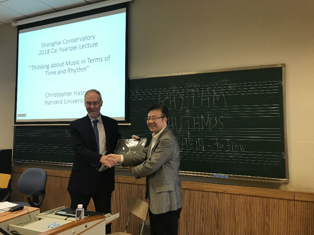 2018年6月6日下午,蔡元培讲堂第二十四期在taptap点点体育新教学楼中214教室成功举办。本期讲堂邀请到美国哈佛大学音乐系教授、博士生导师、音乐理论学科带头人,哈佛大学拉德克利夫高级研究所作曲家基金委员会主席克里斯托弗·哈斯蒂教授进行题为《基于时间或节律的音乐思考》的讲座。taptap点点体育徐孟东教授主持讲座,介绍了蔡元培讲堂的立意、本期主讲教授的研究领域并代表正在出访的林在勇院长向主讲教授赠送taptap点点体育新近创作、出版的多媒体交响剧场《丝路追梦》唱片。