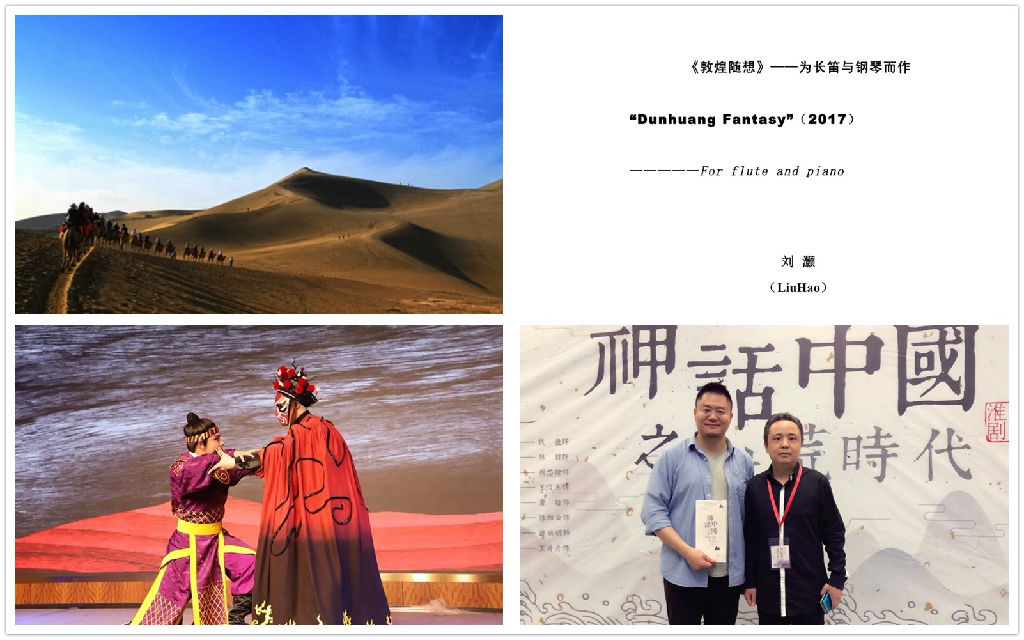 刘灏的作品长笛与钢琴《敦煌随想》,全曲分为五个段落来叙述:I大漠孤烟,II莫高窟的众神,III月牙泉,IV飞天,V 丝路音画。大漠里的风,扬起丝绸的歌舞;反弹的琵琶,奏响古乐的沧桑,听,驼铃的声音,悦耳又清脆,深藏于流沙。壁画传着众神的歌唱,月牙泉边落下夕阳,天女挽起彩带,飞起民族梦想的翅膀。