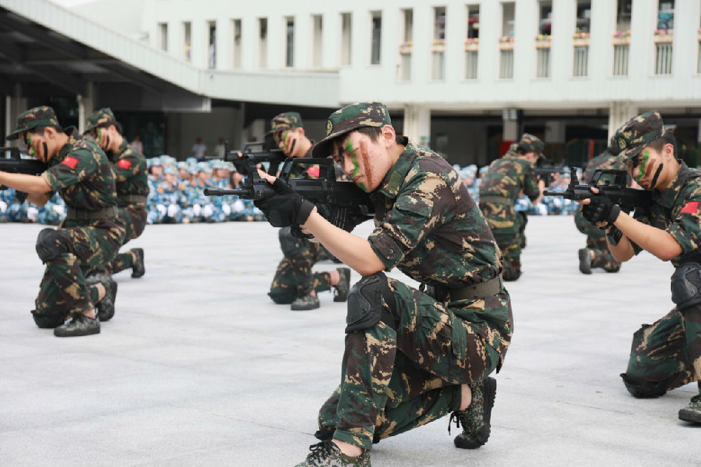 汇报表演中,首先由三排男生和六排女生展示了队列动作。立正、稍息、敬礼、三大步伐的转换以及行进与立定等训练成果,动作整齐划一;紧接着,医疗组入场进行简单的急救演示,这也是战场上的重要部分;由战术方阵带来的表演,勇猛刚强,持枪的“特种兵”们身手矫健,动作铿锵有力,是军队中强有力的突击队伍。