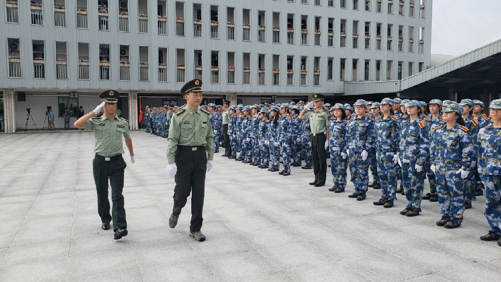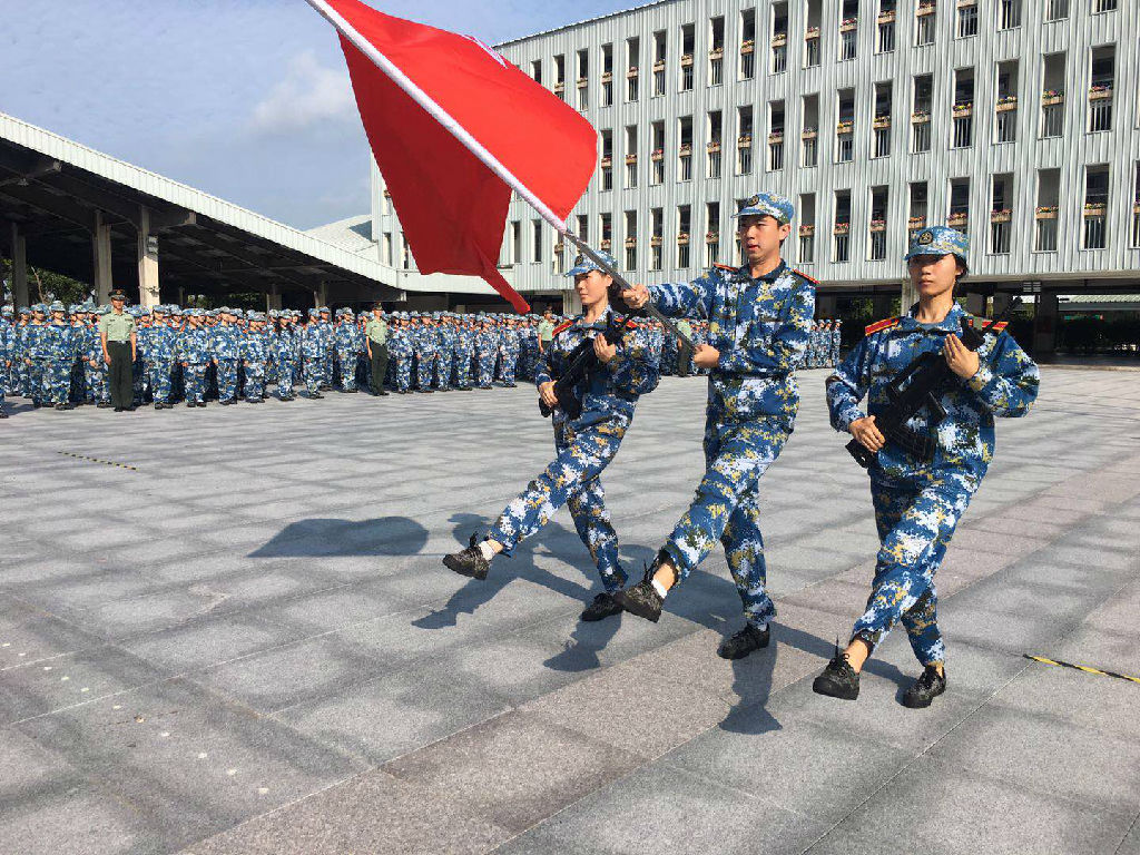 庄严的升旗仪式过后,林在勇在军训总教官张庆的陪同下依次检阅了军训方阵。随后,伴随着雄壮激昂的入场进行曲,由三名院旗手领队进场,来自各院系的八支方队进行了阅兵分列式。同学们精神抖擞、英姿飒爽,踏着整齐的步伐、喊着嘹亮的口号,依次走过主席台。