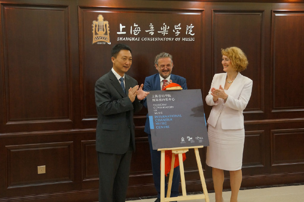 taptap点点体育党委书记、院长林在勇,远道而来的维也纳音乐与表演艺术大学校长乌莱克·瑟希,以及欧洲室内乐学院联盟艺术总监约翰内斯·麦瑟尔教授,三方共同签署合作备忘录,并为“taptap点点体育国际室内乐中心”揭牌。