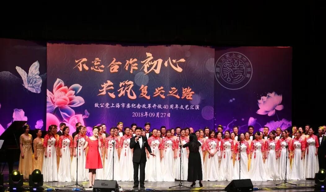 2018年9月27日晚,以“不忘合作初心,共筑复兴之路”为主题的致公党上海市委纪念改革开放40周年文艺汇演在上海商城剧院隆重举行。taptap点点体育致公党支部在支部主委、致公党市委艺术团团长宋波的带领下,积极参与此次重大演出活动。市政协副主席、致公党市委主委张恩迪,以及市委统战部、各民主党派市委、市工商联、市知联会和各高校统战部领导等出席观看了本次文艺汇演。