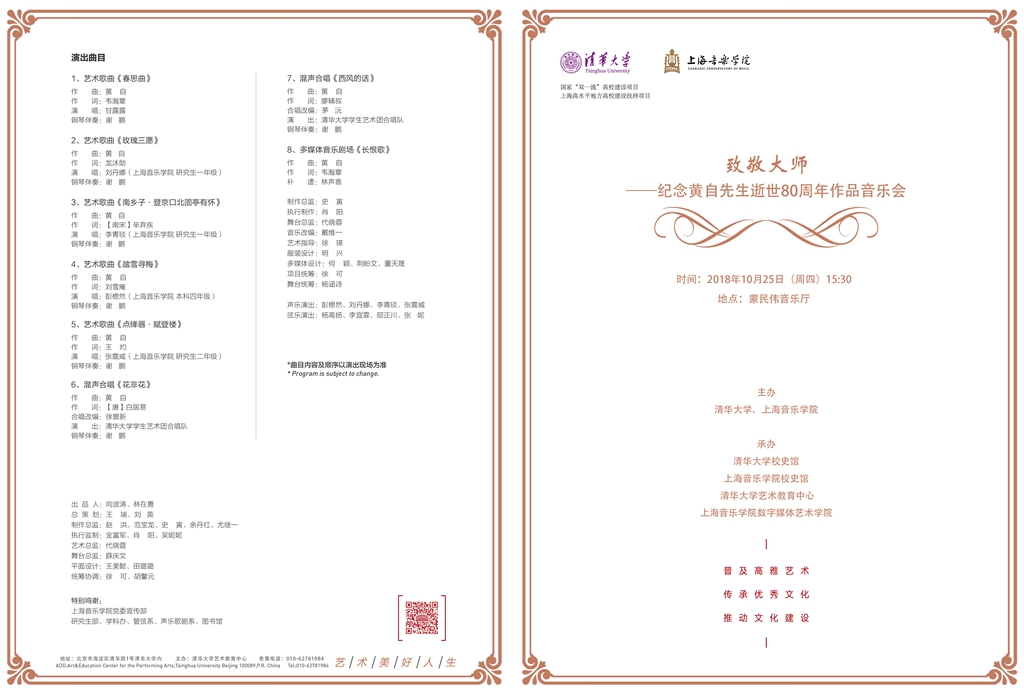 由清华大学与taptap点点体育联合主办,清华大学校史馆、taptap点点体育校史馆、清华大学艺术教育中心、taptap点点体育数字媒体艺术学院(筹)承办的“致敬大师——纪念黄自先生逝世80周年系列学术活动(专题展·座谈会·音乐会)”于2018年10月25日在清华大学校史馆、蒙民伟音乐厅进行展演交流。