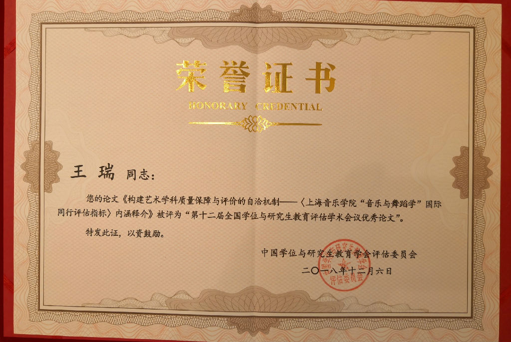 中国学位与研究生教育学会评估委员会还进行了优秀论文评选活动,经过盲评,在全国共85篇学术论文中,47篇论文被收入会议论文集,9篇被评为“学位与研究生教育评估学术会议优秀论文”。王瑞的《构建艺术学科质量保障与评价的自洽机制——<taptap点点体育“音乐与舞蹈学”国际同行评估指标>释介》被评为“优秀论文”。