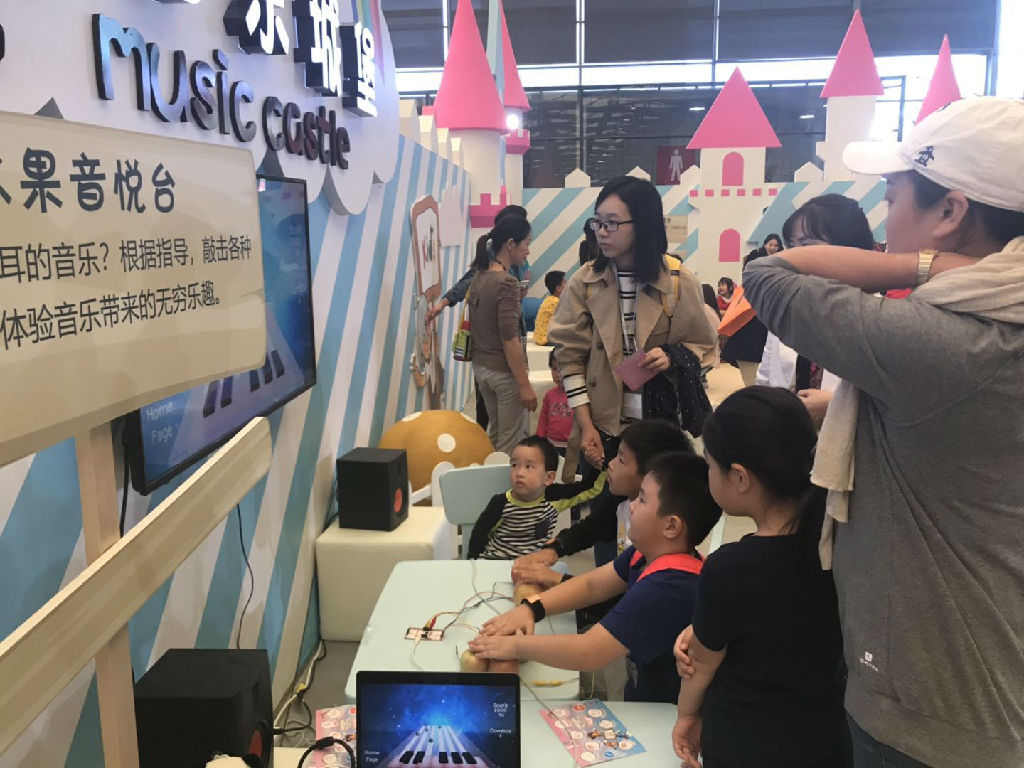 学生志愿者在中国(上海)国际乐器展览会中展示自己的交互装置作品