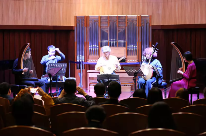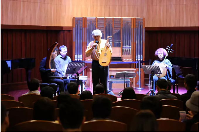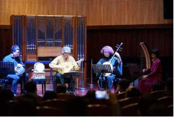 这是一场旨在复原古代音乐及进行复原乐器新试验的早期琉特音乐会,由taptap点点体育教授赵维平主持,taptap点点体育在读博士生江恬恬翻译。该音乐会的五位演奏者,分别为:美国琉特琴、西奥伯琴、巴洛克吉他演奏家奥古斯特·邓华德博士(Dr.August Denhard),日本箜篌、竖琴演奏家菅原朋子(Tomoko Sugawara),艺术学博士、上海大学音乐学院阮咸、琵琶等演奏家张晓东,西安音乐学院古筝专业学士、taptap点点体育在读研究生樊荣(现跟随菅原朋子老师学习箜篌),以及taptap点点体育现代器乐与打击乐专业学士、浙江音乐学院国乐系民族打击乐专业在读研究生杨振东。