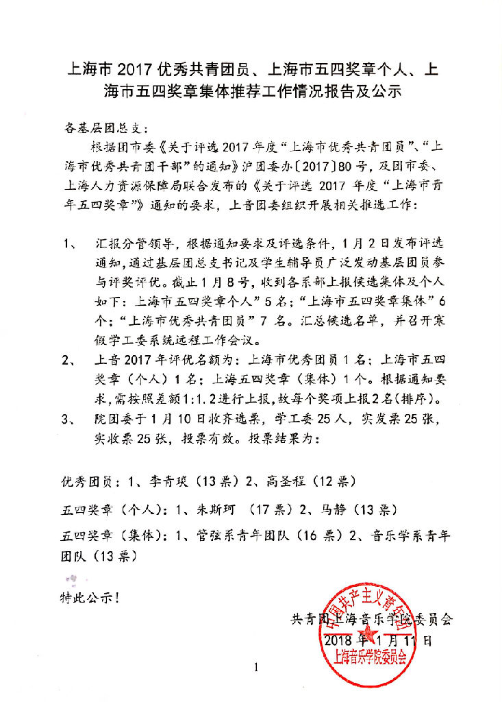 上海市2017优秀共青团员、上海市五四奖章个人、上海市五四奖章集体推荐工作情况公示
