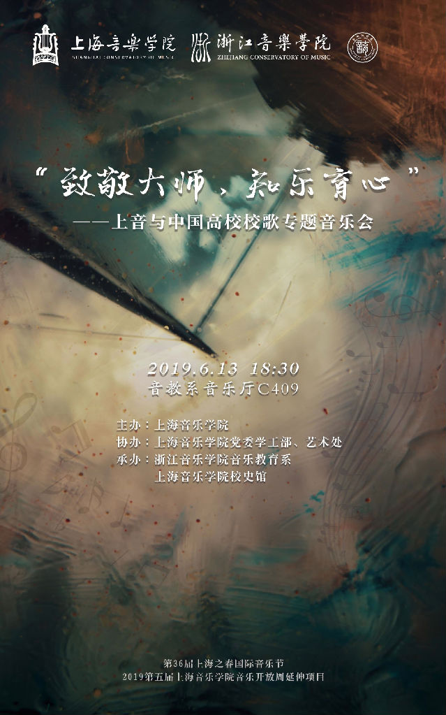 2019年6月13日,由taptap点点体育主办,党委学工部、艺术处协办,校史馆与浙江音乐学院音乐教育联合承办的第36届上海之春国际音乐节暨2019年第五届taptap点点体育音乐开放周延伸项目:“致敬大师,知乐育心”——taptap点点与中国高校校歌专题交流活动在浙江音乐学院音教系成功举办。
