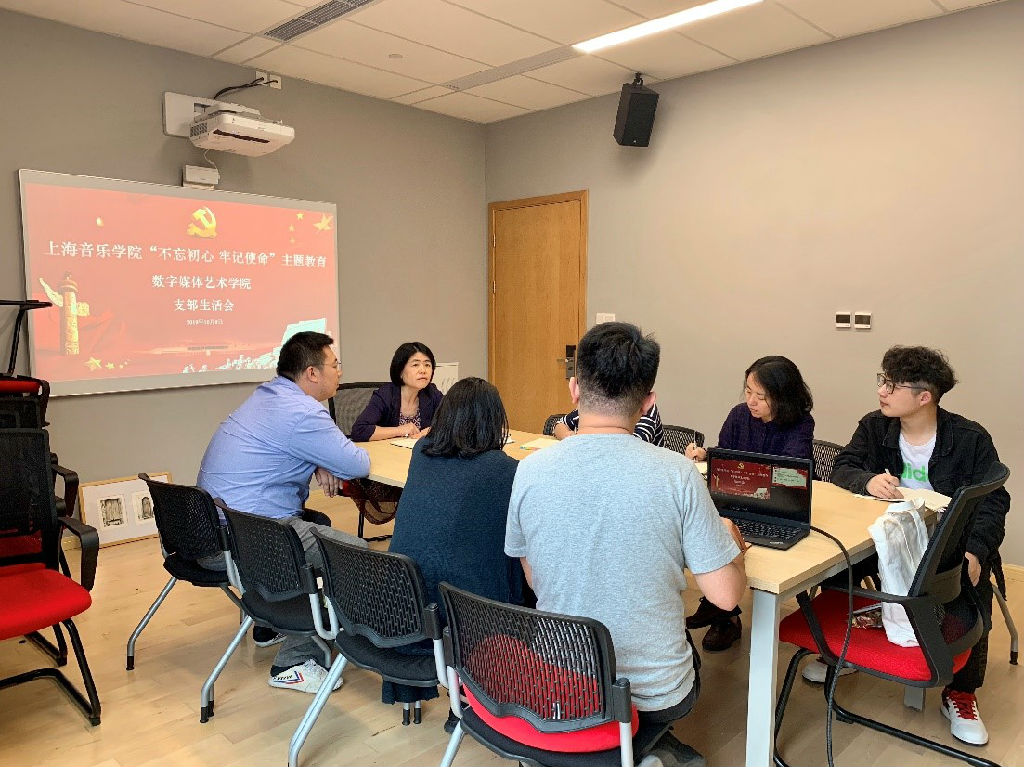2019年10月9日星期三下午12时30分,数字媒体艺术学院党支部在零陵路教学大楼602室开展集中学习活动,数媒学院党支部副书记邹新娟主持,程瑜怀、杜巍巍、尹晓楠、戴维一、范恺,鲍天龙出席学习活动。