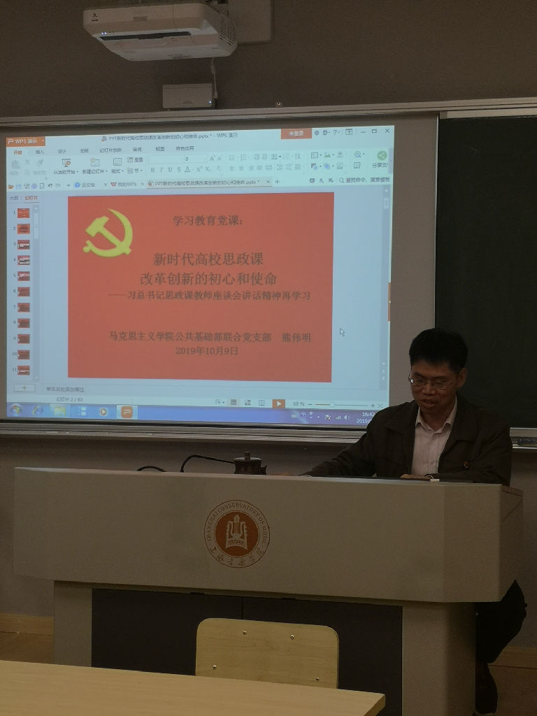 第二部分,熊伟明作为联合党支部主持工作的副书记,为大家做了题为《新时代高校思政课改革创新的初心和使命——习近平总书记思政课教师座谈会讲话精神再学习》主题党课。讲课内容从思政课程的地位和作用、思政课程改革创新的要义、方法以及重点在于思政课老师等几个方面做了剖析和解读。讲课联系学校实际,把中央对思政课教师以及其他公共课教师、课程思政课的教师的要求做了揭示和解读。