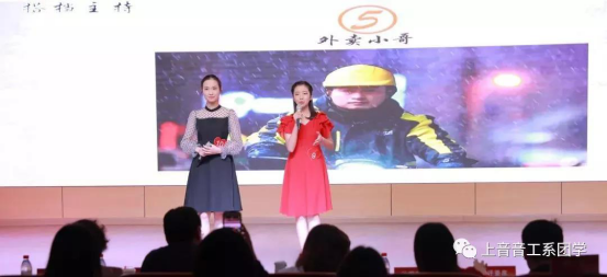 在搭档主持环节中,陈雯净和上海外国语大学白宇共同进行,围绕“外卖小哥”这个话题模拟主持了一档生活类节目,以一张心酸的雪天送外卖的图片开题,以基层劳动人民为社会付出贡献的温暖结题。
